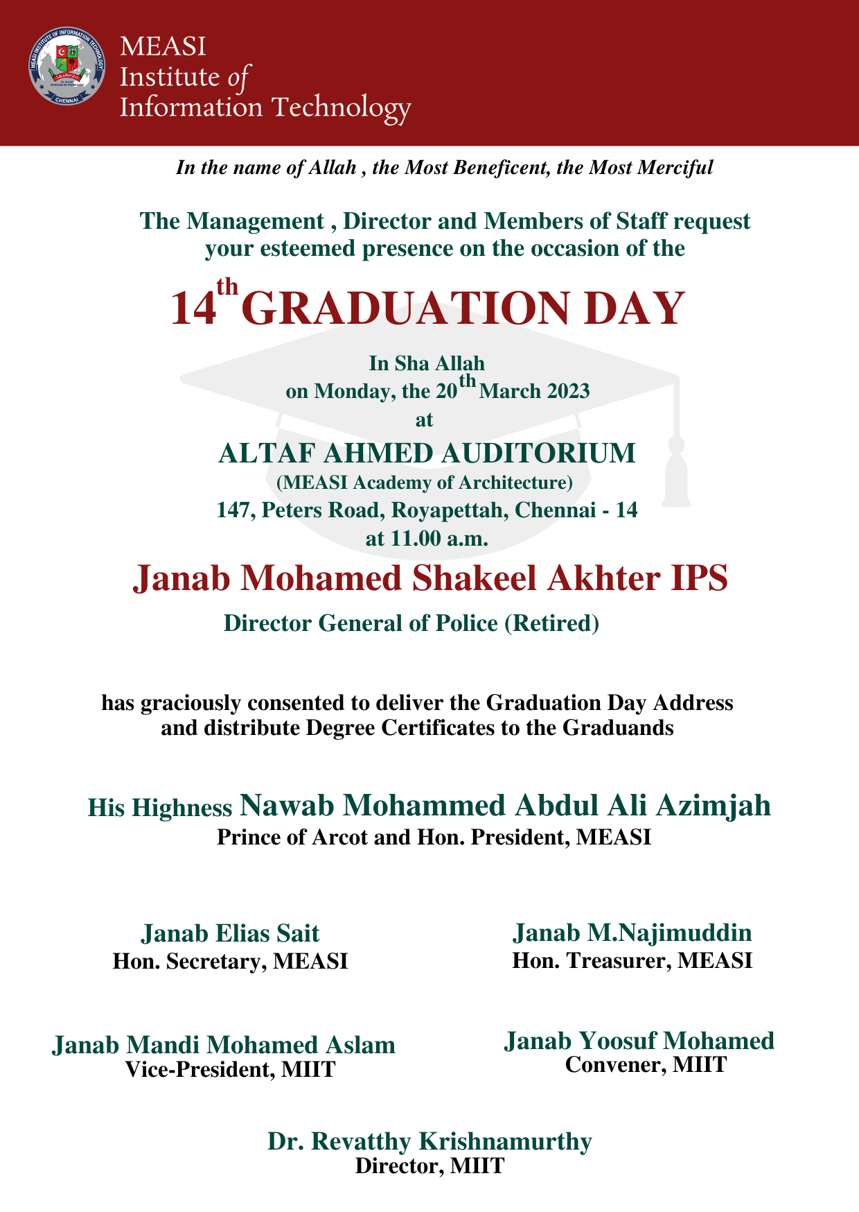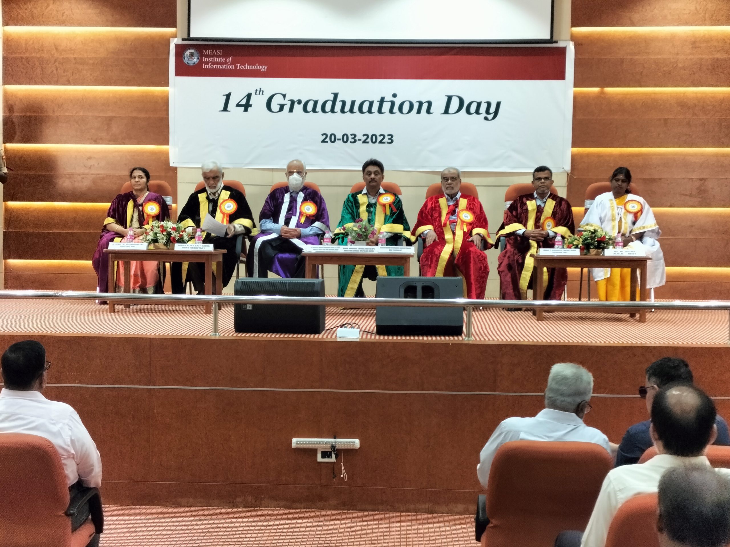 MEASI Institute of Information Technology conducted its 14th Graduation Day on 20th March 2023 for the MCA batch of 2018-2021 Passed out at Altaf Ahmed Auditorium. Janab Mohamed Shakeel Akhter IPS, Director General of Police (Retired) delivered the Graduation Day Address and distributed Degree Certificates to the Graduands.