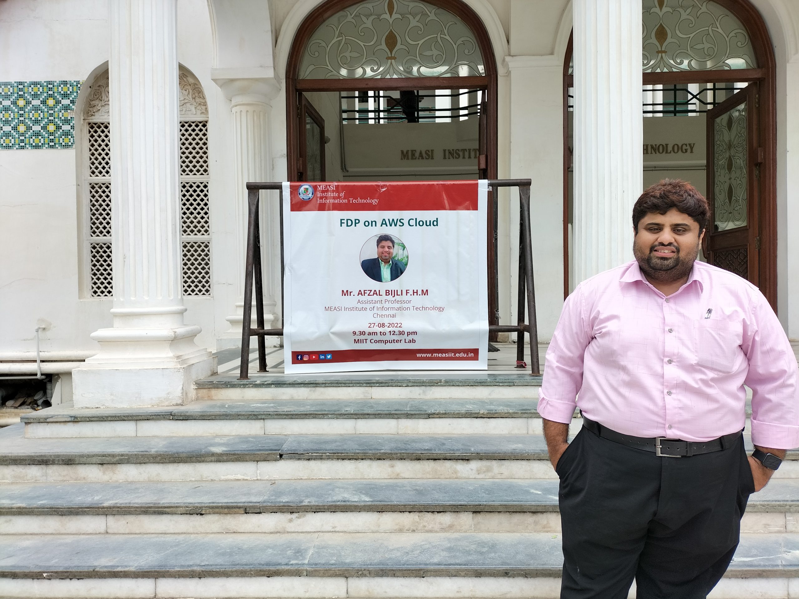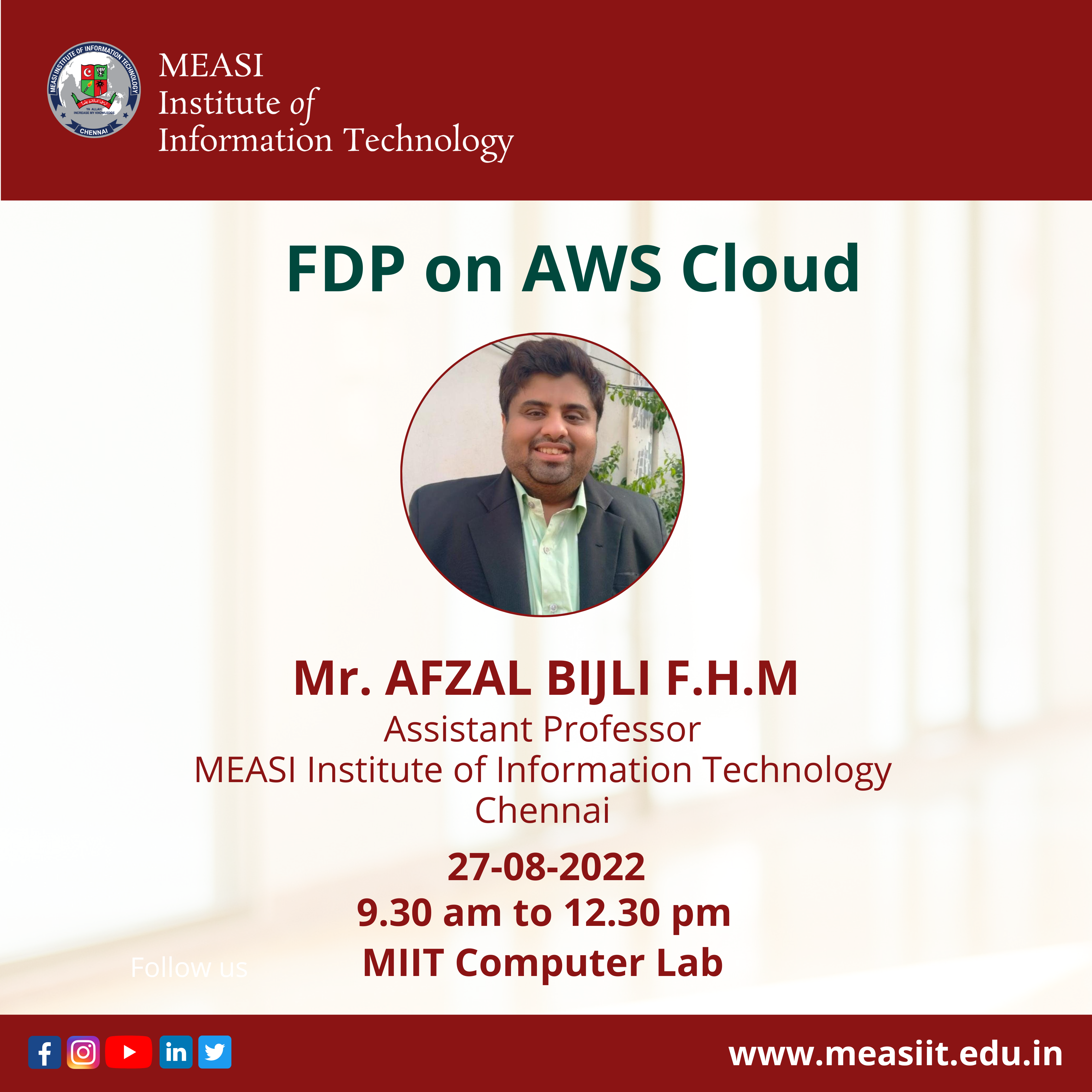 FDP on AWS Cloud MEASI Institute of Information Technology is conducted a Faculty Development Program on AWS Cloud on Saturday, 27th August 2022 from 9.30 am to 12.30 pm by Mr.Afzal Bijli, Assistant Professor – MEASI IT at MIIT Computer Lab.