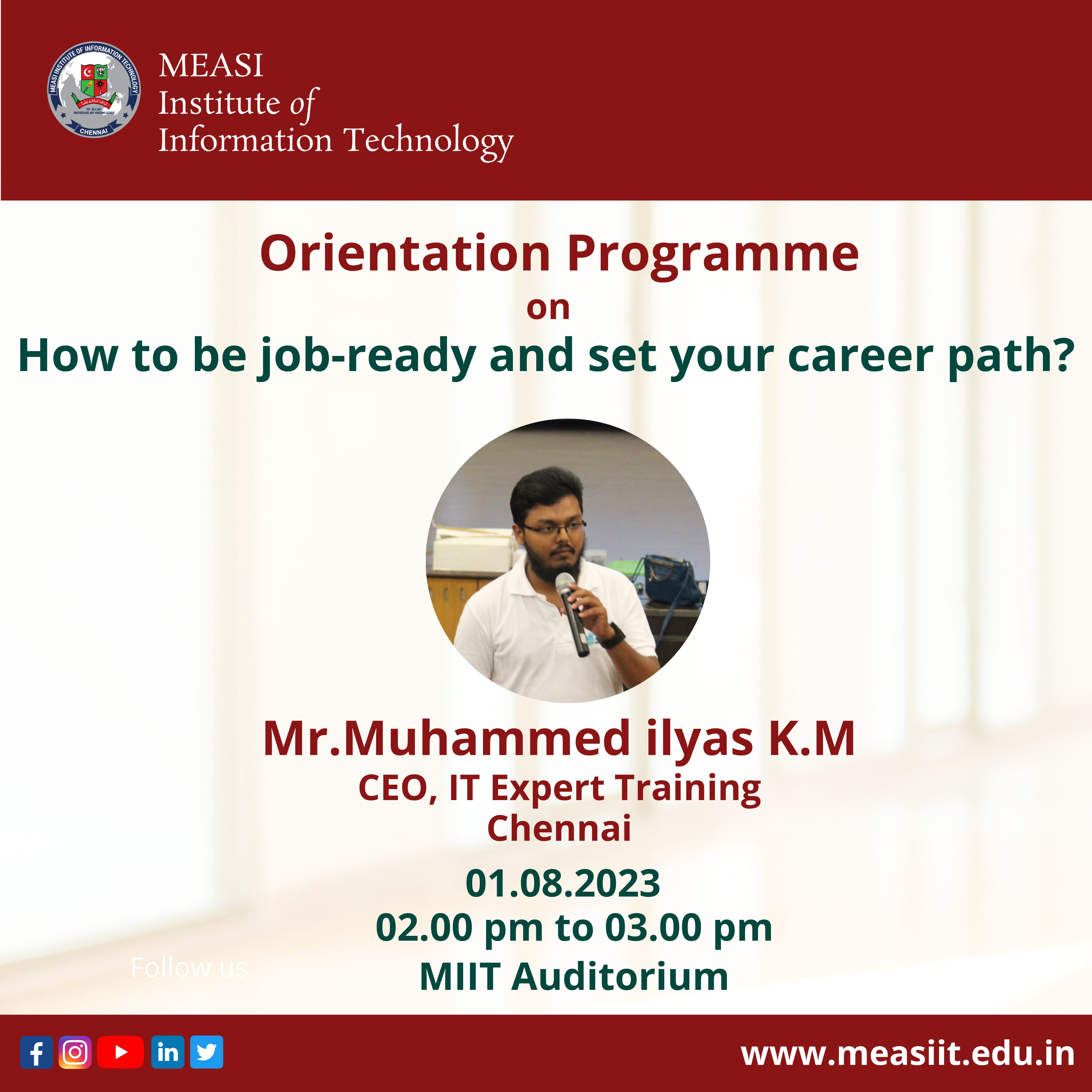 MEASI Institute of Information Technology organized an Orientation Programme on “How to be Job ready & set your career path?” by Mr.Muhammed Iliyas, CEO- IT Expert Training on 01st August 2023 from 02.00 pm to 03.00 pm at MIIT Auditorium.