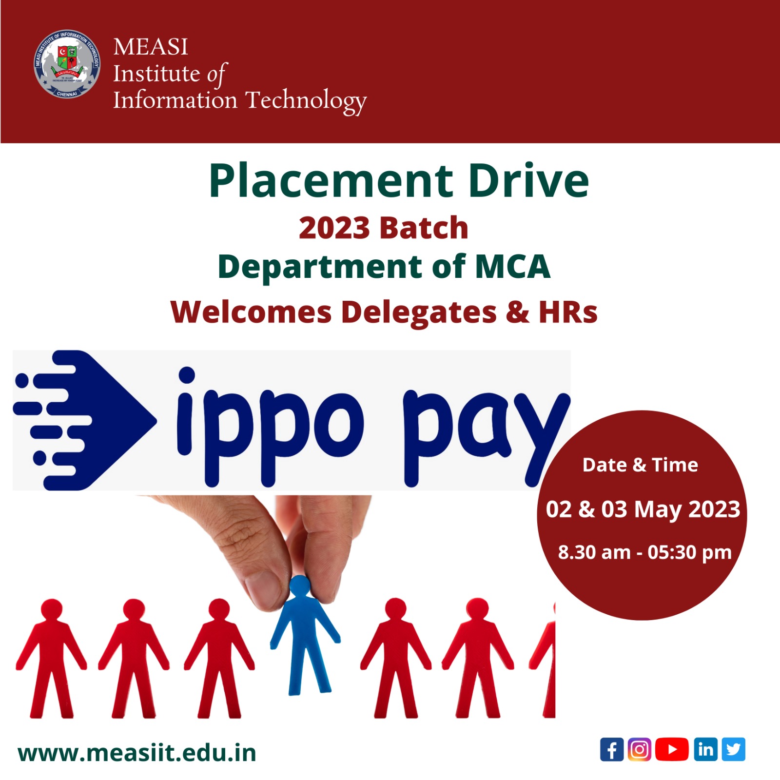 MEASI Institute of Information Technology organized a Placement Campus Drive by IPPO PAY for the Final Year MCA Students of Batch 2021-23 on the 2nd & 3rd of May 2023. Around 280 students from other colleges also participated in the drive.