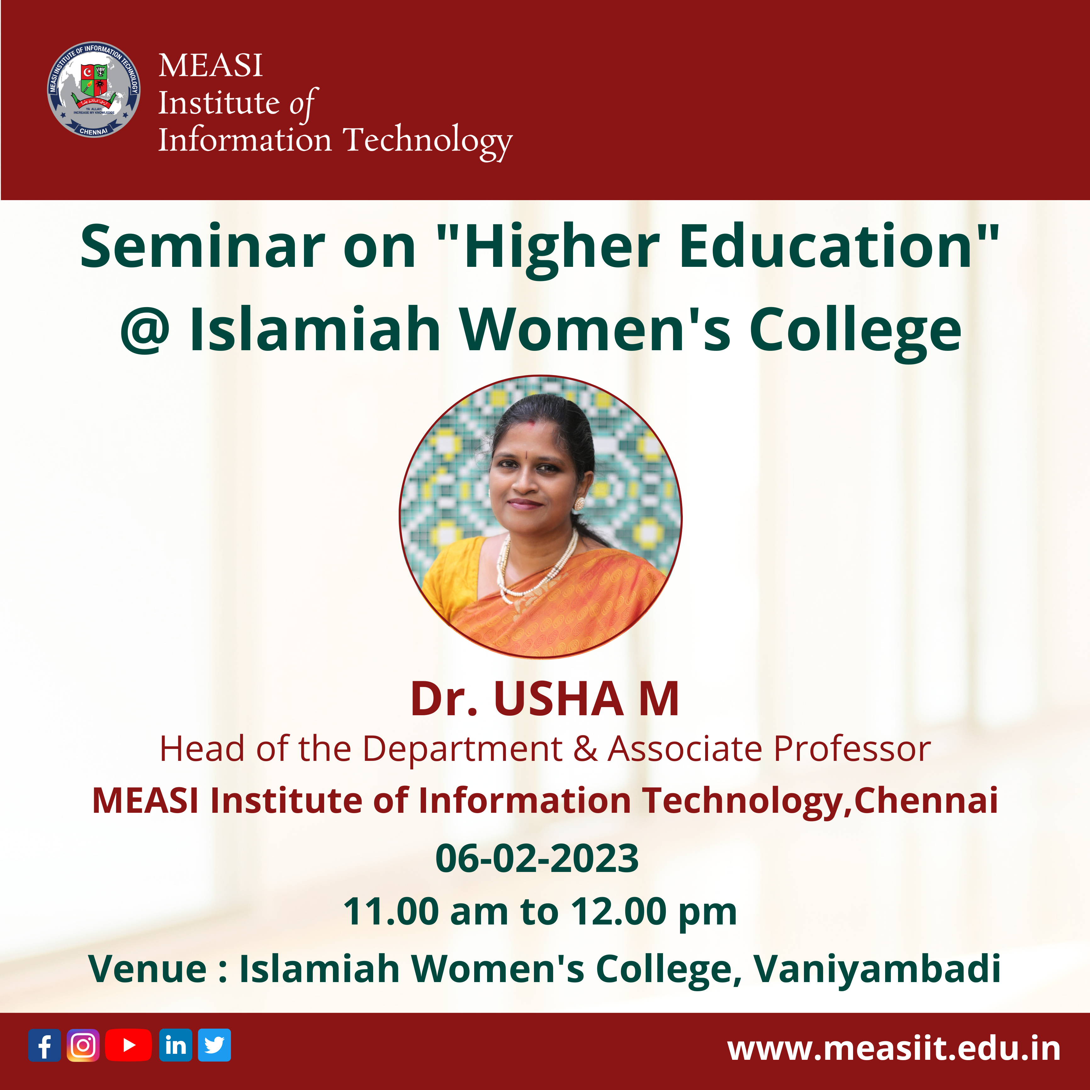 MEASI Institute of Information Technology conducted a Seminar on “Higher Education” on Monday, 06th February 2023 from 11.00 am to 12.00 pm by Dr. Usha M, Head of the Department & Associate Professor – MEASI IT, Chennai at Islamiah Women’s College(Vaniyambadi).