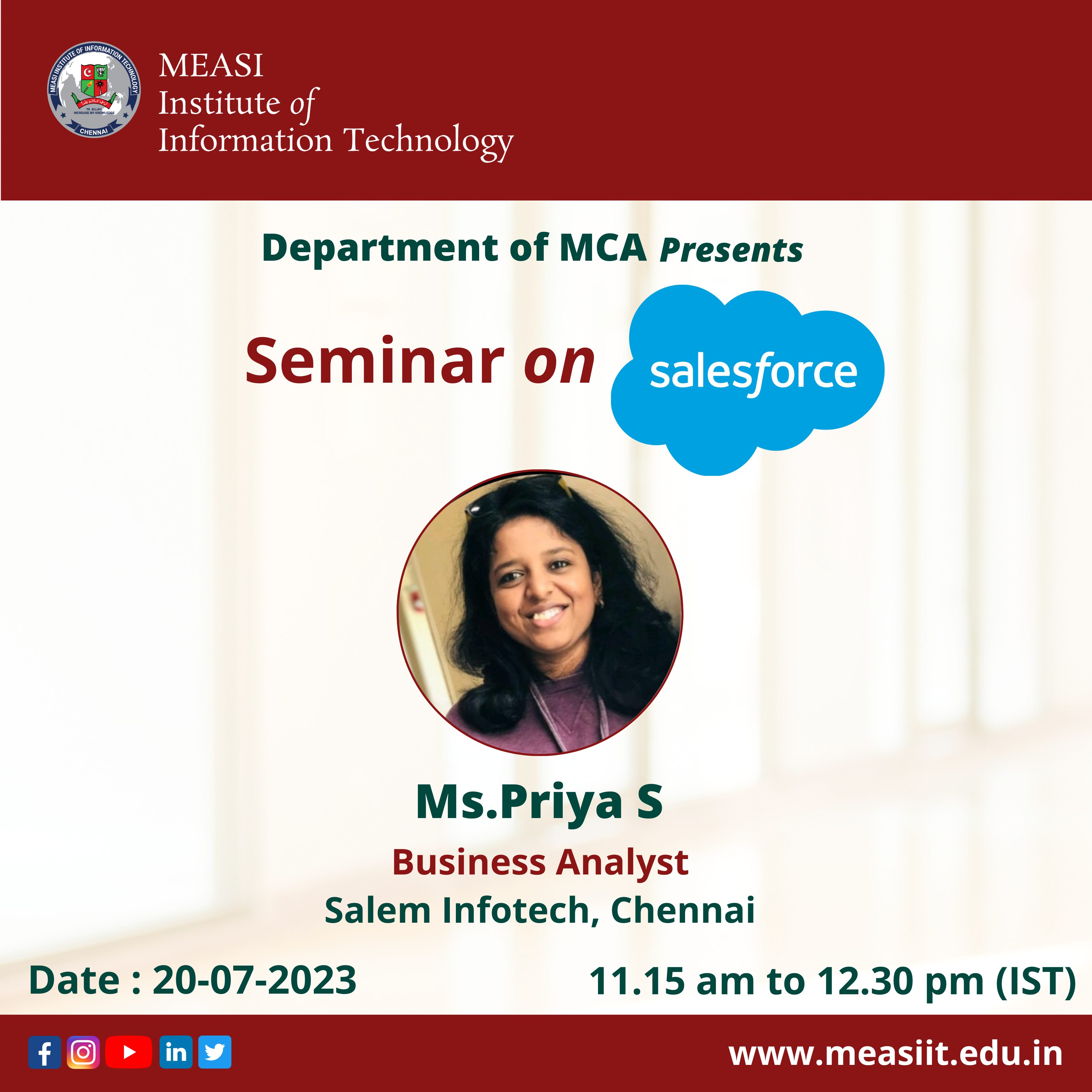 MEASI Institute of Information Technology organized a Seminar on SalesForce by Ms.Priya S ,Business Analyst – Salem Infotech, Chennai on Thursday, 20th July 2023 from 11.15 am to 12.30 pm for final year MCA Students at MIIT Auditorium.