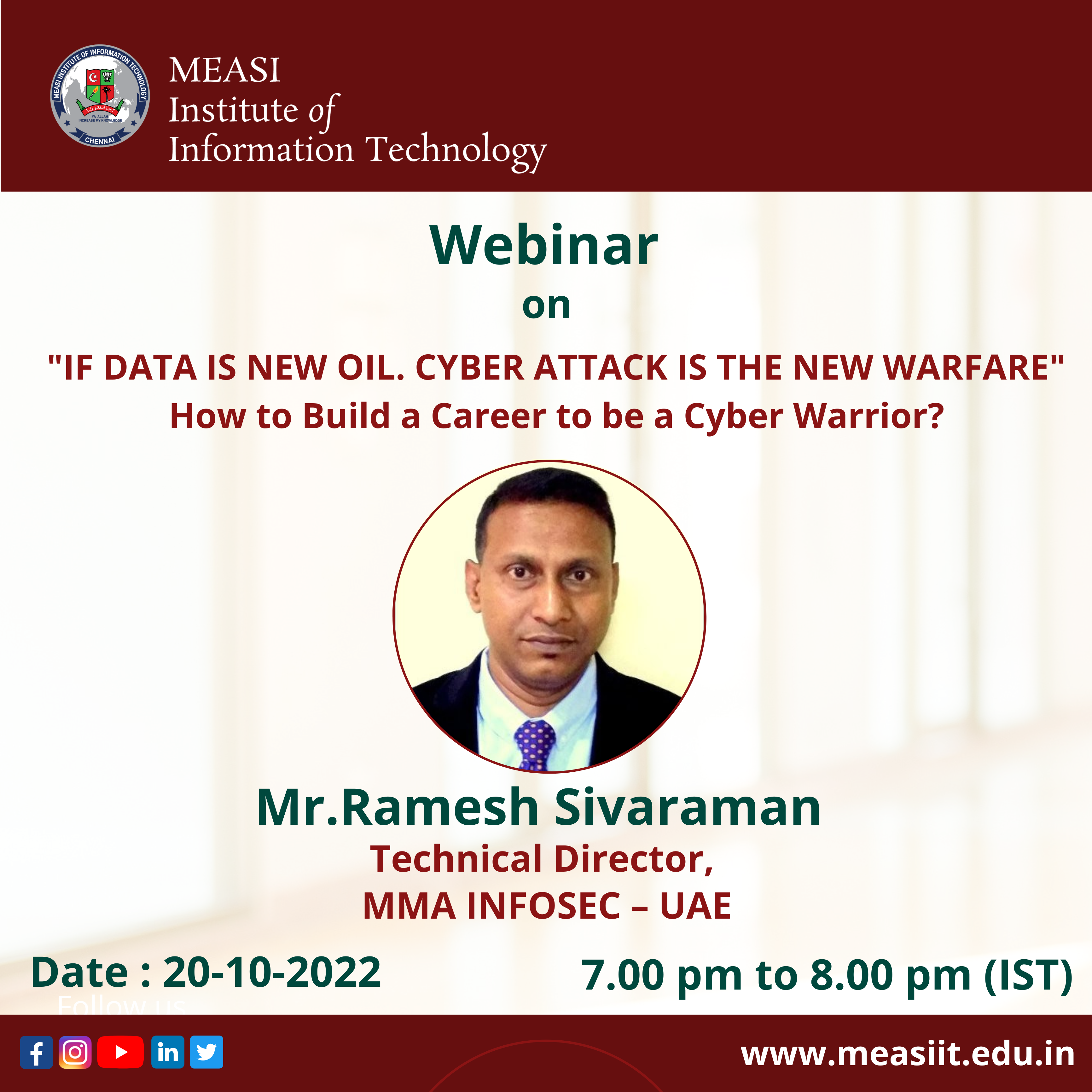 MEASI Institute of Information Technology conducted a Webinar on “IF DATA IS NEW OIL. CYBER ATTACK IS THE NEW WARFARE” – How to Build a Career to be a Cyber Warrior? on Thursday, 20th October 2022 from 7.00 pm to 8.00 pm (IST) by Mr.Ramesh Sivaraman, Technical Director, MMA INFOSEC – UAE through Zoom.